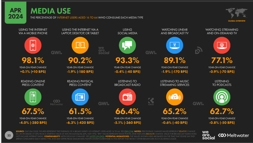 Meltwater and We Are Social have released Digital 2024: April Statshot, a quarterly update on social media and digital trends worldwide. The report highlights the global Internet adoption figure, with over two-thirds of the world's population now online, marking a 3.4% annual increase in internet users. At a local level, Australia ranks among the top nations for paying for digital content, especially video and music, and has one of the highest percentages of gambling app users. [Read more]
