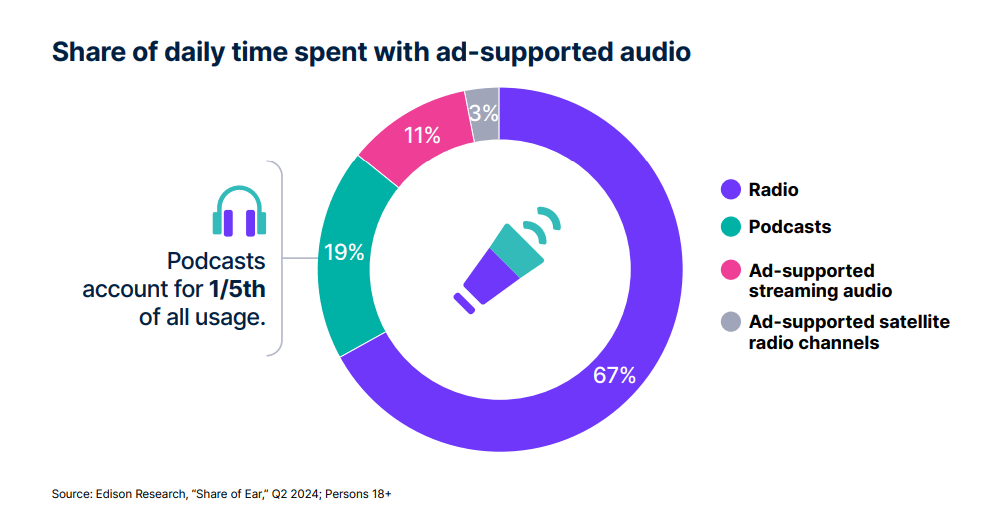 A 2024 study on the "Share of Ear" conducted by Edison Research and Nielsen said Americans average more than four hours of daily audio consumption, making podcasts a key channel in cross-media marketing strategies.