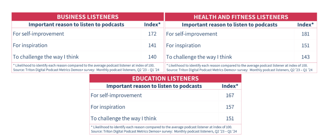 It naturally appeals to true crime and fiction listeners that are looking for advertisers to take them away with mental escapes: mindless tasks and interesting stories. This is usable in host-read ads and announcer reads by tailoring them for specific audiences, and pre-produced ads can fit listener expectations from their favorite podcasts to help create effective strategies.