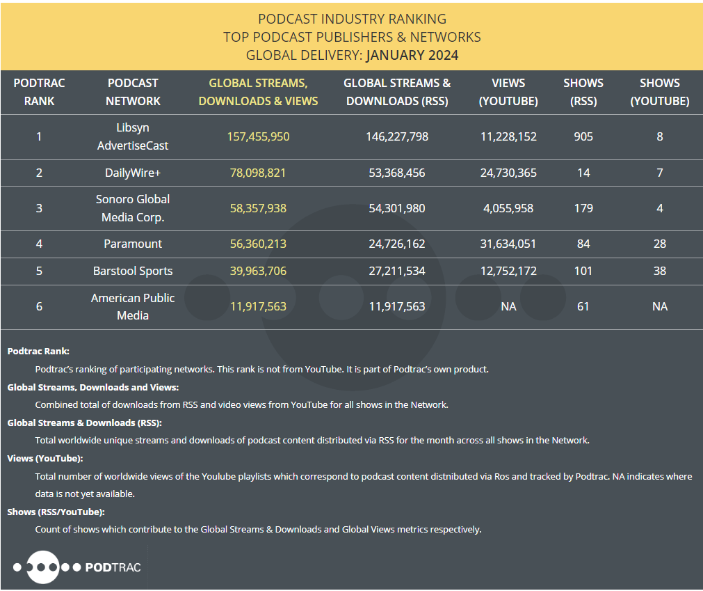 The Podcast Global Industry Ranking of Top Publishers and Networks is the newest ranking released by Podtrac, the first and most significant metrics and ranking provider in the podcast industry. For the first time, advertisers, agencies, and the industry at large can access the global reach of leading podcast publishers and networks. Additionally, Podtrac's new Global ranking takes into account podcast viewership on YouTube, another industry first, while traditional podcast metrics and rankers have concentrated on the RSS distribution of podcasts.