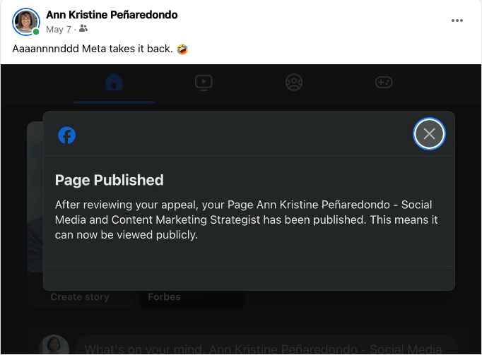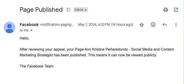 A few hours later, I received a notification and an email that my Facebook Page was no longer restricted.