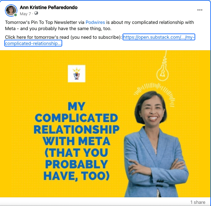 I thought of sharing the newsletter announcement from my Facebook personal account to my Facebook Page. It’s been a while since I’ve done that, but I tried it anyway.