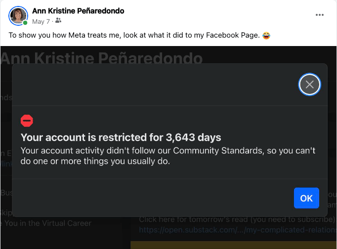 Meta said that I violated their guidelines. To add insult to injury, Meta said that my Page is restricted for 3,643 days.