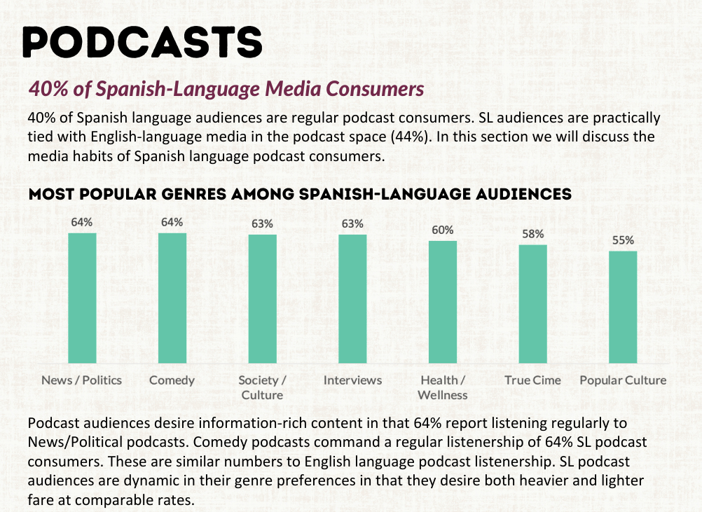Knowledge of Spanish-speaking consumer media habits will enable podcasters to tailor the growing content towards such a demographic, therefore, increasing their listening numbers in any given space.