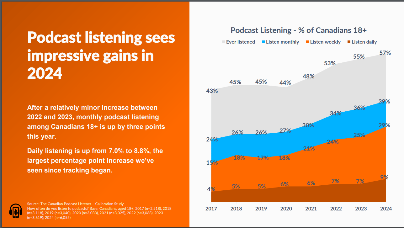 Matt Hird, Senior Research Director at Signal Hill Insights, found, according to the Canadian Podcast Listener study, which is the longest-running comprehensive podcast research initiative tracking since 2017, that monthly podcast listening in Canada has increased from 26% to 39% of adults. Such a shift in listening and demographic reach gives much to understand about the ever-evolving landscape of podcasts.