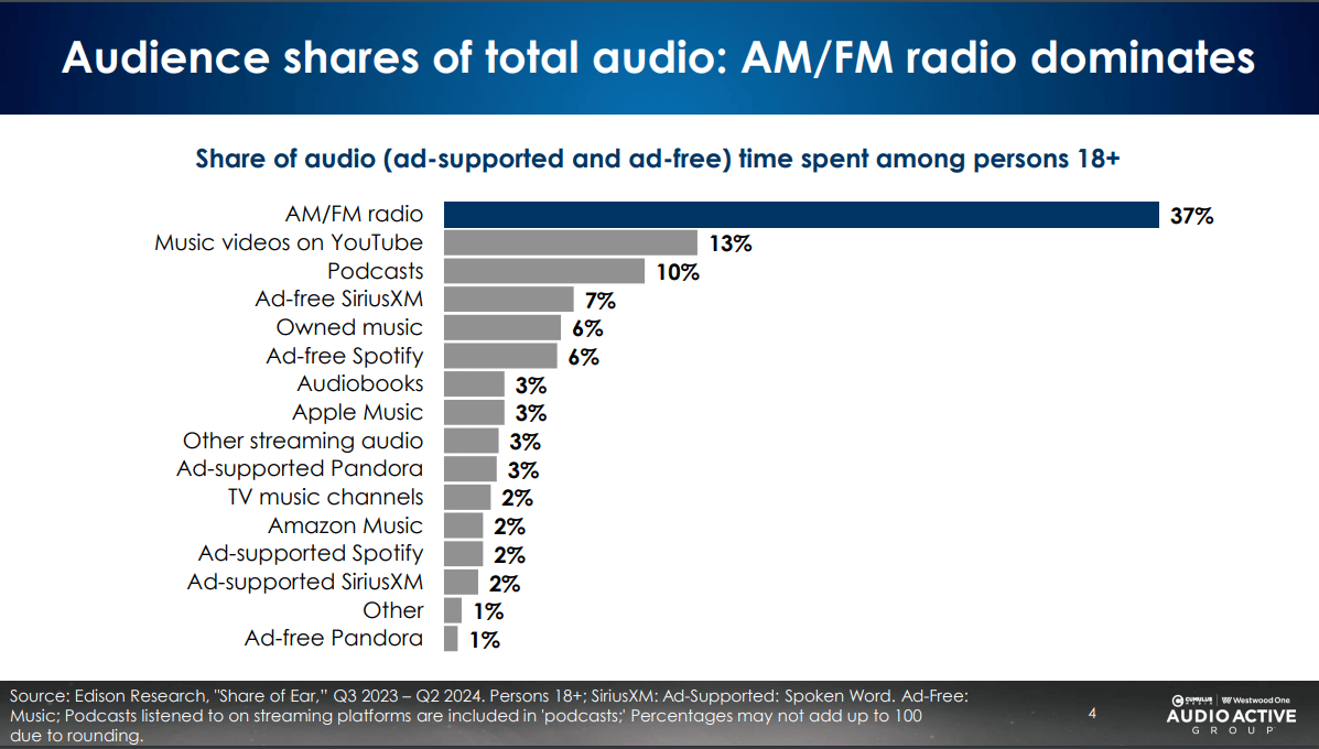 Sources and Methods: Edison Research's "Share of Ear" study is a deep analysis of how Americans consume audio that surveys 1,000 people in the United States aged 13 and older on a quarterly basis. The results here are based on a one-year rolling average of 4,000 respondents. Edison is the leading provider of AM/FM radio research and creator of the Infinite Dial study widely covered regarding consumer adoption of new media platforms.