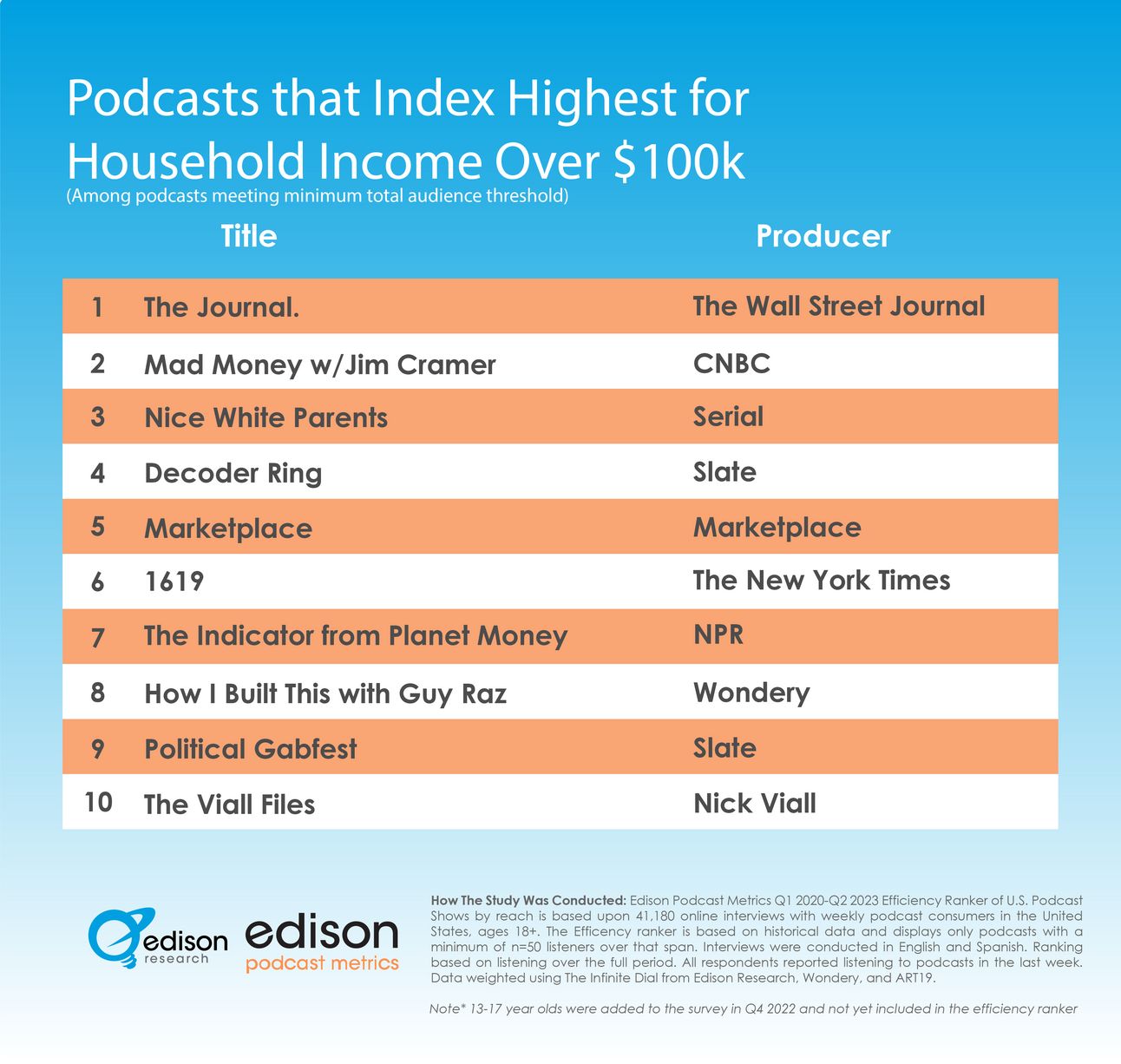 This week, Edison Research examined which programmes are best at attracting listeners with high incomes. These are the top ten shows, and more than half of their viewers come from households with an annual income of over $100,000 for each of them: