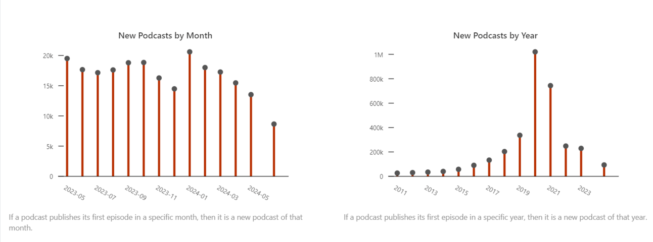 Every month in 2024 shows an attrition of new podcasts. It reported 8,652 (0.263%) debuts in June compared to May's 13,525 (0.411%) debuts. The highest number of show launches this year hit in January with 20,598 (0.627%).