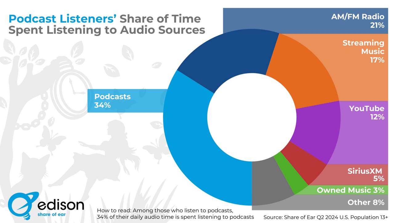 Podcasting comprises 34% of daily audio listening. AM/FM radio and radio streams follow at 21%. Music streaming at 17%.