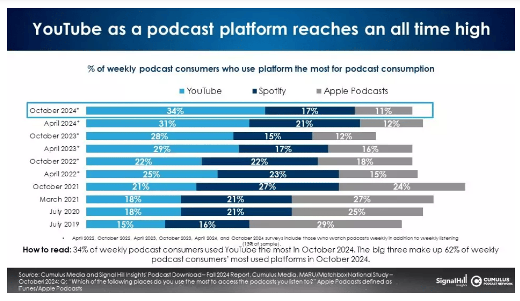 YouTube reached an all-time high of 34% as the most-used podcast platform-to-date, way over Spotify's 17% and Apple's 11%