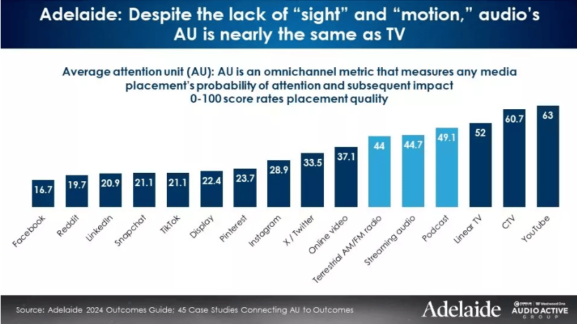 Attention is defined by the Advertising Research Foundation as the degree by which persons exposed to the advertising are focused on it. Adelaide's attention unit—or AU—score helps compare advertising attention across media, which shows that the same degree of ad attention on AM/FM radio would require twice the spending on display digital ads compared to TikTok, Snapchat, LinkedIn, and Reddit.