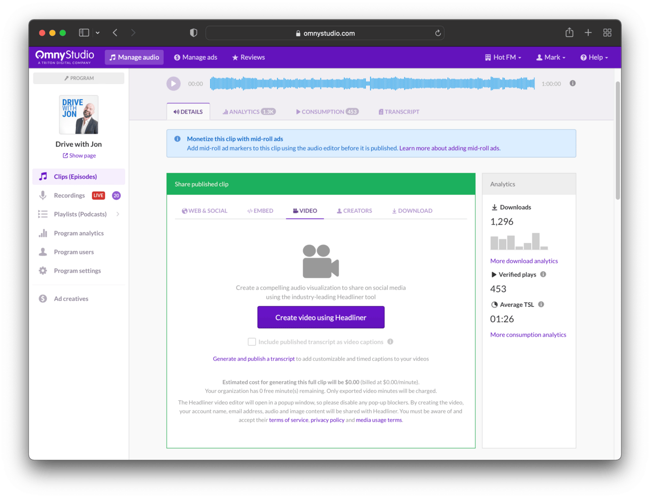 Publishers are already using Headliner in Omny Studio to publish full episode and clip audiograms with waveforms, subtitles, and imagery to social media and video sites. Expanding on this capability, building on this capability, podcast publishers are now more easily able to create videos for their episodes and have engaging audiograms auto-shared on their YouTube podcast channels.