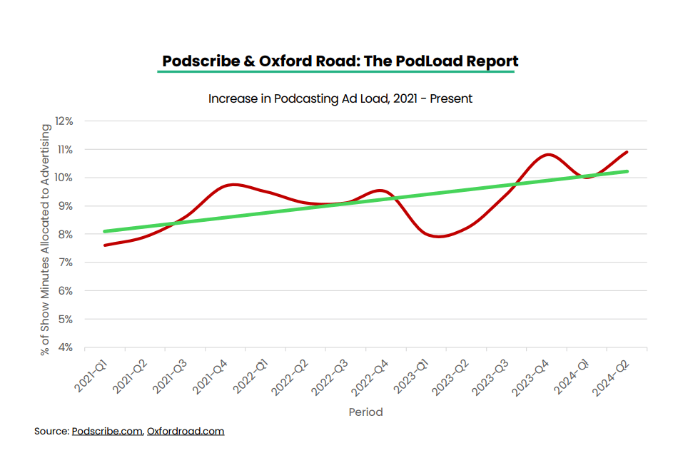 According to the PODLOAD REPORT: Ad Load Landscape from Oxford Road and Podscribe Study, there has been a 39% increase since Q1 2021 in Q1 2024, with the top 50 programs at an average ad load of 10.2% on the Apple Podcast Ranker.