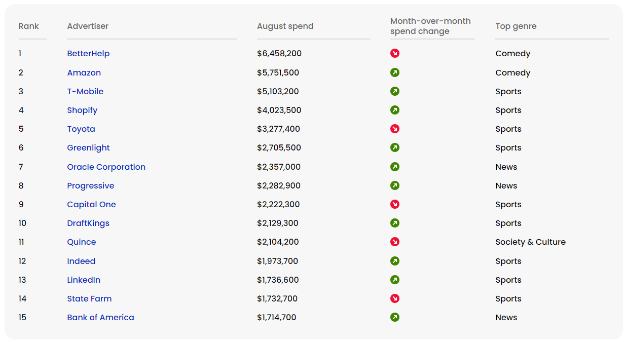🚨 Podcast Insight: BetterHelp Leads Podcast Advertising Boom, Spending Over $6.4 Million in August 2024