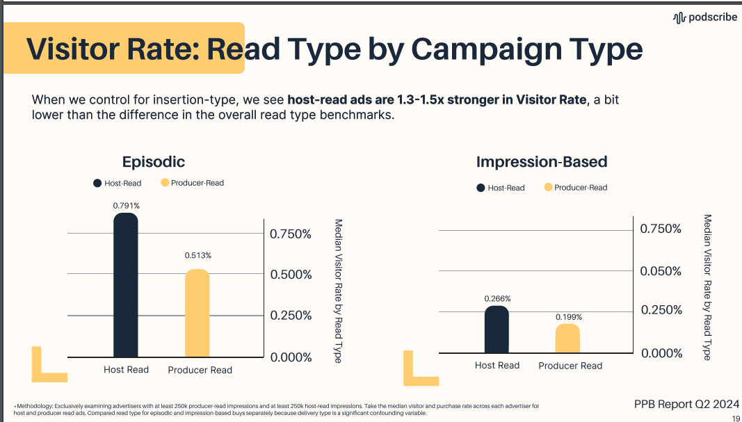 As a matter of fact, host-read advertisements do 50% better than producer-read ads. But when episodically purchased, the producer-read ads bring down this gap to 24%, where host-read ads may justify commanding a premium price. It will also help control frequency when running producer-read ads to improve an advertiser's performance across their total podcast budget.