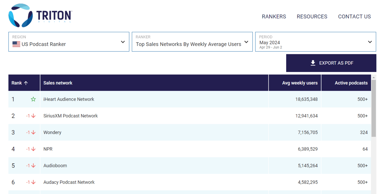 Global technology and services provider Triton Digital has announced the release of its U.S. Podcast Ranker for the May 2024 reporting period: April 29, 2024 – June 2, 2024.