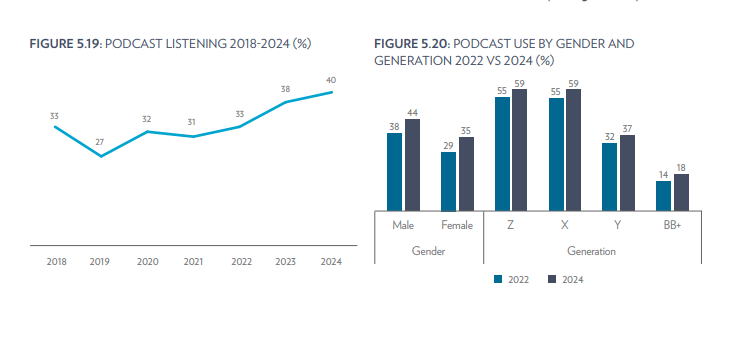 Podcast listening continues to increase, rising 2 percentage points from last year to 40%, and up a total 7 percentage points since 2022.