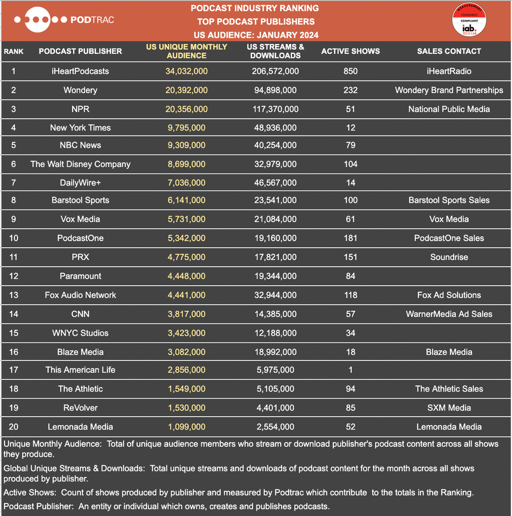 The Top Podcast Publishers and Top Podcasts rankings for January are now available at www.Podtrac.com.