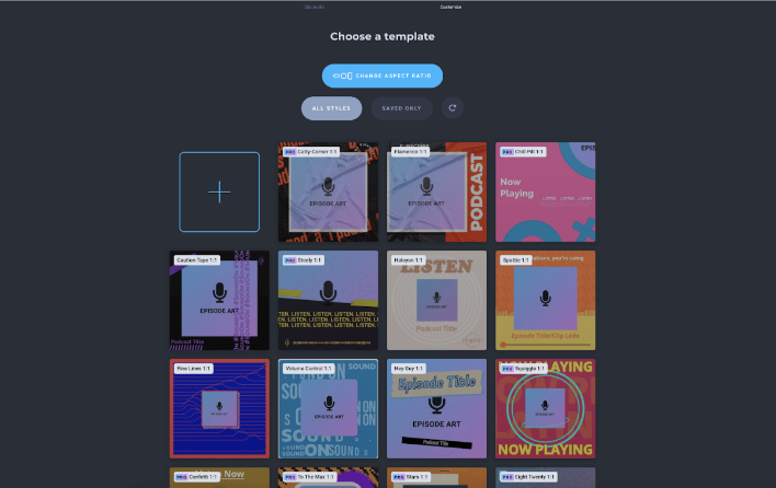 To create videos that match your podcast’s style, choose from one of our pre-made templates or design your own by clicking the blue plus sign.