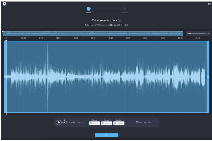 The integration allows Simplecast users to create podcast video clips from their audio files. To get started, select your clip by adding exact time stamps or through simple waveform editing:
