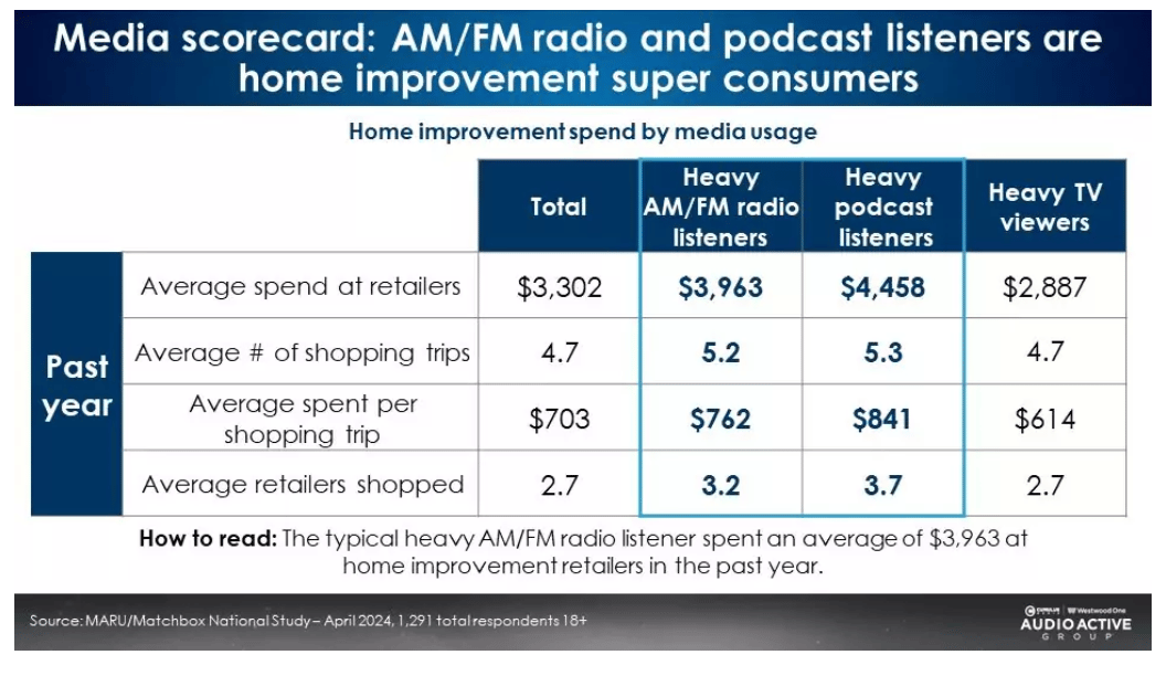 Massive audio users are big home improvement shoppers: According to the latest consumer research from Cumulus Media | Westwood One Audio Active Group,® podcast listeners and AM/FM radio listeners are massive home improvement shoppers, spending much more than heavy TV viewers.