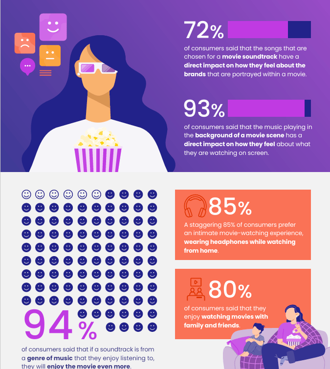 Based on Veritonic's research, 90% of consumers are more likely to watch a movie if they like the music on its soundtrack, while 98% of consumers are more likely to watch a movie if they like the music in its trailers.
